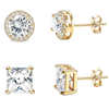 Elevate your accessory game with this stunning 2 pair set of 18K gold plated stud earrings, This curated collection includes a pair of sophisticated 8.5mm round halo studs and a pair of classic 7mm princess cut solitaires, both featuring high brilliance simulated diamond CZ stones. Designed for the modern woman who values variety and luxury, these hypoallergenic and nickel free earrings provide a radiant, ethical sparkle perfect for daily wear or multi piercing styling.